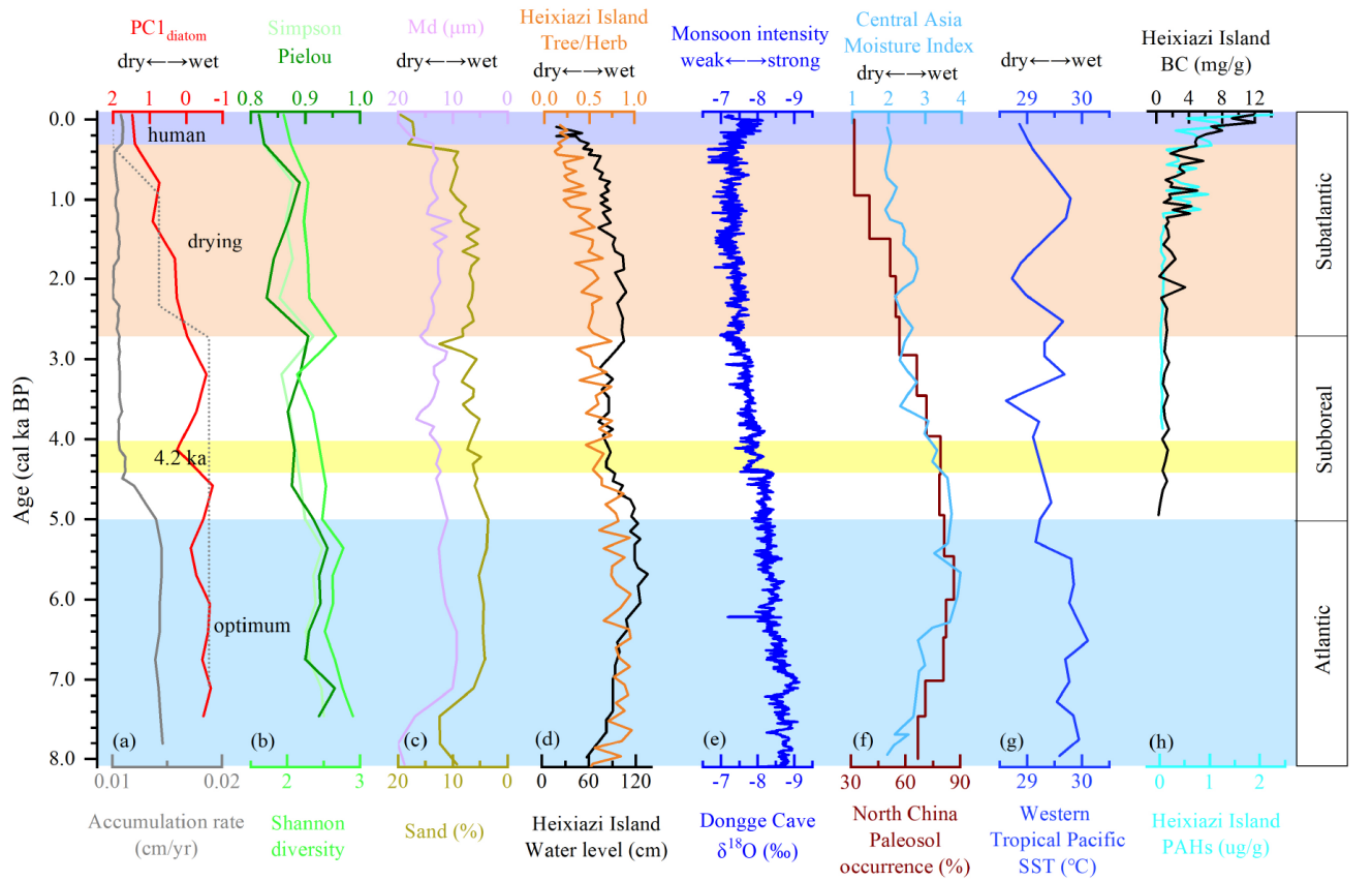 東北地理所大氣環(huán)境與生態(tài)演變學(xué)科組基于多指標(biāo)古生態(tài)學(xué)記錄,結(jié)合硅藻和粒度特征,重建了抓吉濕地歷史時(shí)期水位變化過程,探討中晚全新世三江平原濕地水文演化對(duì)EASM的響應(yīng)機(jī)制。研究結(jié)果表明:抓吉濕地的水位波動(dòng)在全新世中晚期與EASM強(qiáng)度緊密相關(guān)。由于硅藻對(duì)水文氣候變化的高度敏感性,其清晰地記錄了溫暖濕潤(rùn)的全新世氣候適宜期、中世紀(jì)暖期,以及寒冷干燥的4.2ka事件和小冰期等關(guān)鍵氣候事件。在大西洋時(shí)期,抓吉濕地的PC1diatom、粒度中值粒徑和砂含量均處于最低水平,表明當(dāng)時(shí)水位最高。受強(qiáng)EASM影響,氣候條件適宜,抓吉濕地的硅藻物種多樣性及沉積物累積速率均達(dá)到最高。在亞北方期,特別是亞大西洋時(shí)期,PC1diatom和粒度均表明由于EASM強(qiáng)度減弱,抓吉濕地水位持續(xù)下降。濕地干旱化顯著降低了沉積物累積速率和硅藻物種多樣性。值得注意的是,硅藻組合最顯著的變化是300年前干旱指示物種Hantzschia amphioxys和Pinnularia subcapitata突然增加,抓吉濕地的砂含量也達(dá)到峰值。近300年來人類活動(dòng)的加劇導(dǎo)致抓吉濕地嚴(yán)重干旱,硅藻物種多樣性降至最低。三江平原的農(nóng)業(yè)活動(dòng)導(dǎo)致了土壤侵蝕,致使?jié)竦氐某练e速率有所增加。