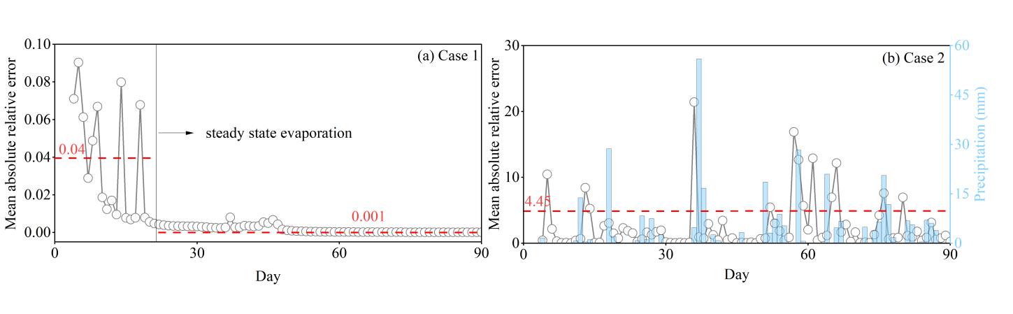 圖1.不同水文條件下土壤水通量梯度近似誤差的變化特征。在穩(wěn)態(tài)條件下誤差較小 (Case 1),而在降雨驅(qū)動(dòng)的非穩(wěn)態(tài)條件下誤差顯著增加(Case 2)。