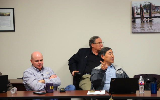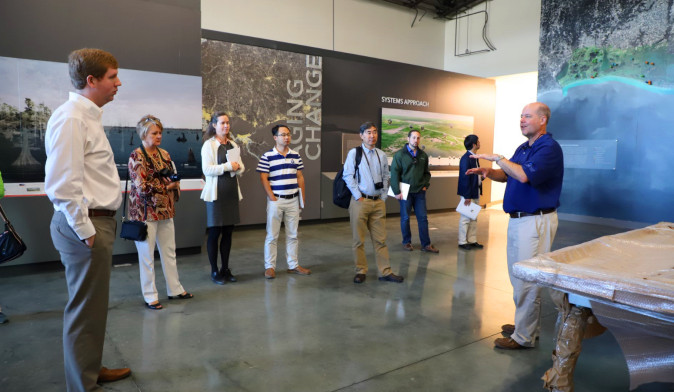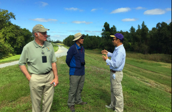 10月16 -17日,在路易斯安那州自然資源部海岸管理辦公室Ed Britton博士、路易斯安娜州立大學(xué)海岸與環(huán)境學(xué)院院長Christopher D'Elia教授、侯愛新教授等相關(guān)專家陪同下,參觀了建造過程中的密西西比河流中心,詳細(xì)了解了密西西比河三角洲濕地大型實景模型模擬的建造過程和未來使用情況。前往墨西哥灣,深入考察了紅樹林及河口三角洲濕地恢復(fù)工程。由于海平面上升和陸地下沉導(dǎo)致濕地大面積喪失,路易斯安那州政府利用河口及濱海的底泥,疏浚到被淹沒的濕地區(qū)域,提高地表以恢復(fù)退化鹽沼。項目組考察了不同恢復(fù)年限下的濕地恢復(fù)區(qū),針對其濕地植被演替、基質(zhì)理化性質(zhì)及水文情勢變化進(jìn)行了深入探討,這為我國濕地基質(zhì)恢復(fù)、應(yīng)對海平面上升的濱海濕地恢復(fù)技術(shù)提供了良好的案例。