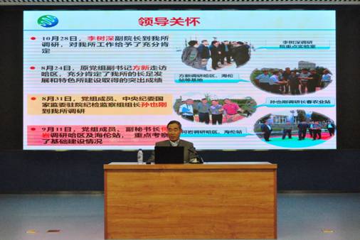 蘇陽書記代表所黨委作2018年黨建工作總結。一年來,在院黨組、省直工委和長春分院分黨組(長春分院系統單位黨委)的正確指導和領導下,在所班子和所廣大黨員、廣大職工的大力支持下,所黨委緊緊圍繞研究所中心工作,以學習黨的十九大精神和習近平新時代中國特色社會主義思想為主線,以“四個意識”導航,以“兩個維護”筑魂,以“兩個全面”強基,充分發揮所黨委和各基層黨支部的戰斗堡壘作用。一是扎實推進“兩個維護”,以政治建設統領黨建工作,自上而下營造學習氛圍,帶動全所掀起學習熱潮。二是深學實做、抓常抓長,推進全面從嚴治黨,貫徹落實院黨組和省直工委關于推進“兩學一做”學習教育常態化制度化實施。三是以提升組織力為重點,扎實推進基層黨的組織建設,兩所區分設黨委辦公室,以加強黨建工作屬地化管理。四是貫徹落實黨風廉政建設責任制,持之以恒抓好作風建設 。