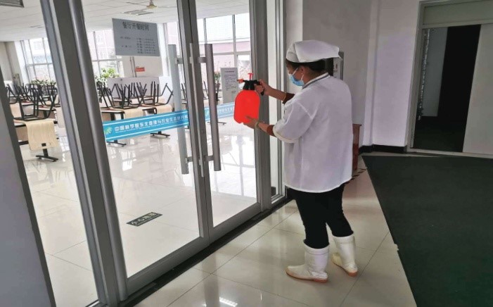 在各辦公樓的樓道總會聞到一股消毒液的味道,雖然味道比較刺鼻,但是會讓職工的心里感到一絲寬慰。每天后勤部門組織人員對所區(qū)重點防控部位進行兩次消殺,兩天進行一次全所范圍消殺。