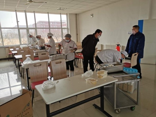 中午時分,后勤和食堂人員已經(jīng)提前在職工微信群里面發(fā)出用餐通知,并按照統(tǒng)計人數(shù)把可口的盒飯送到各個辦公樓,員工自取,避免了集中用餐帶來的風險。所領導強調(diào)一定要搞好食堂衛(wèi)生和保障食材來源安全。