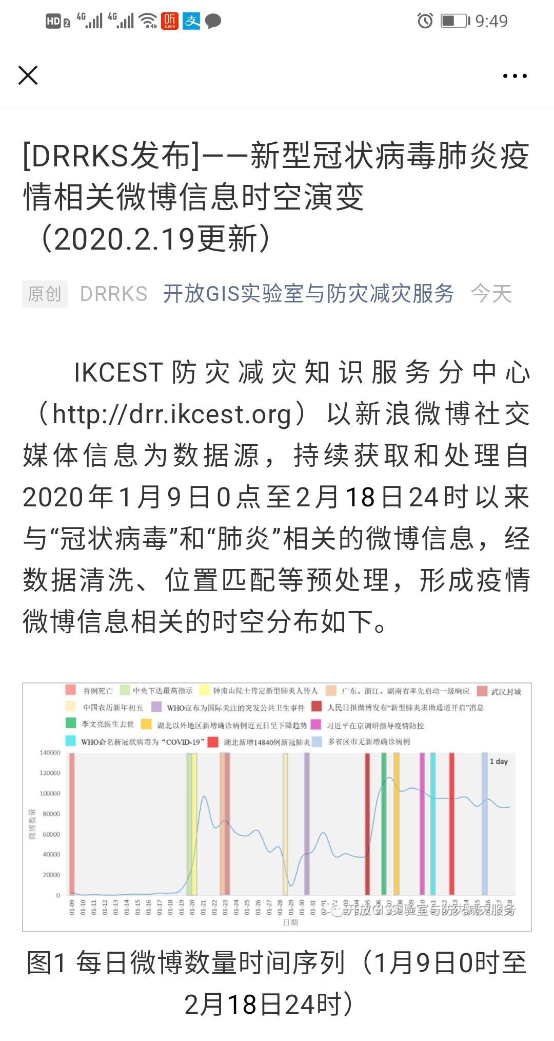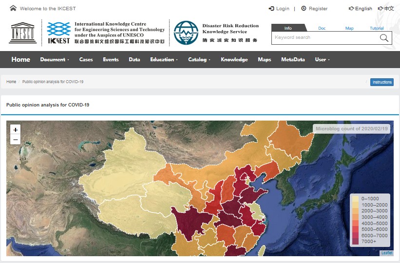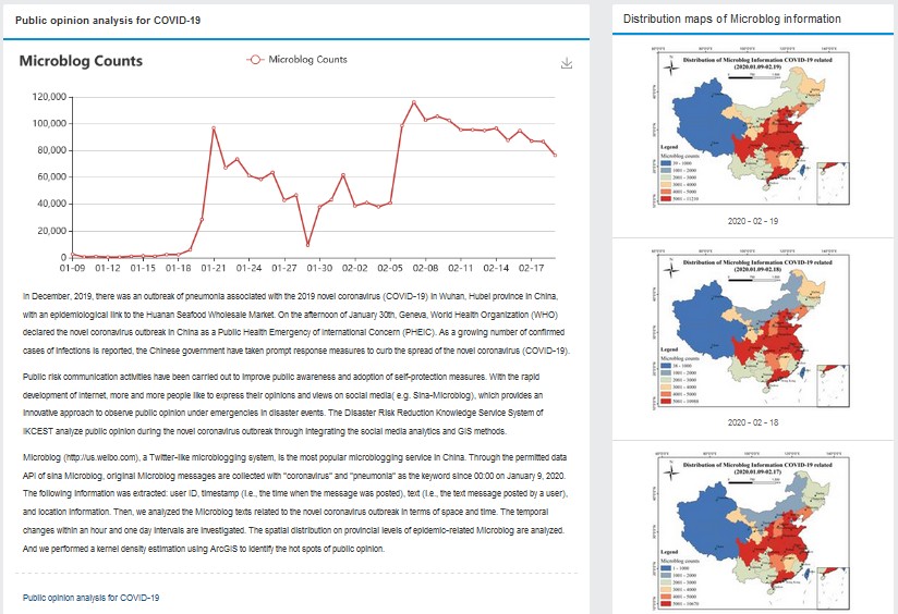東北地理所自2016年來一直參加國際工程科技知識中心—防災(zāi)減災(zāi)知識服務(wù)系統(tǒng)(DRRKS)的開發(fā)建設(shè)工作。本次疫情期間,我所信息中心作為主要技術(shù)團隊,配合中國科學(xué)院地理科學(xué)與資源研究所開展工作,負(fù)責(zé)輿情相關(guān)信息在微信公眾號的信息推送以及 DRRKS 中英文知識應(yīng)用的開發(fā)工作。通過使用開源 WebGIS 技術(shù)與工具,對疫情相關(guān)的輿論信息在地理空間位置上進行可視化表達,對于信息公開及充分了解大數(shù)據(jù)背景下疫情輿論的時空差異及其變化具有重要意義。