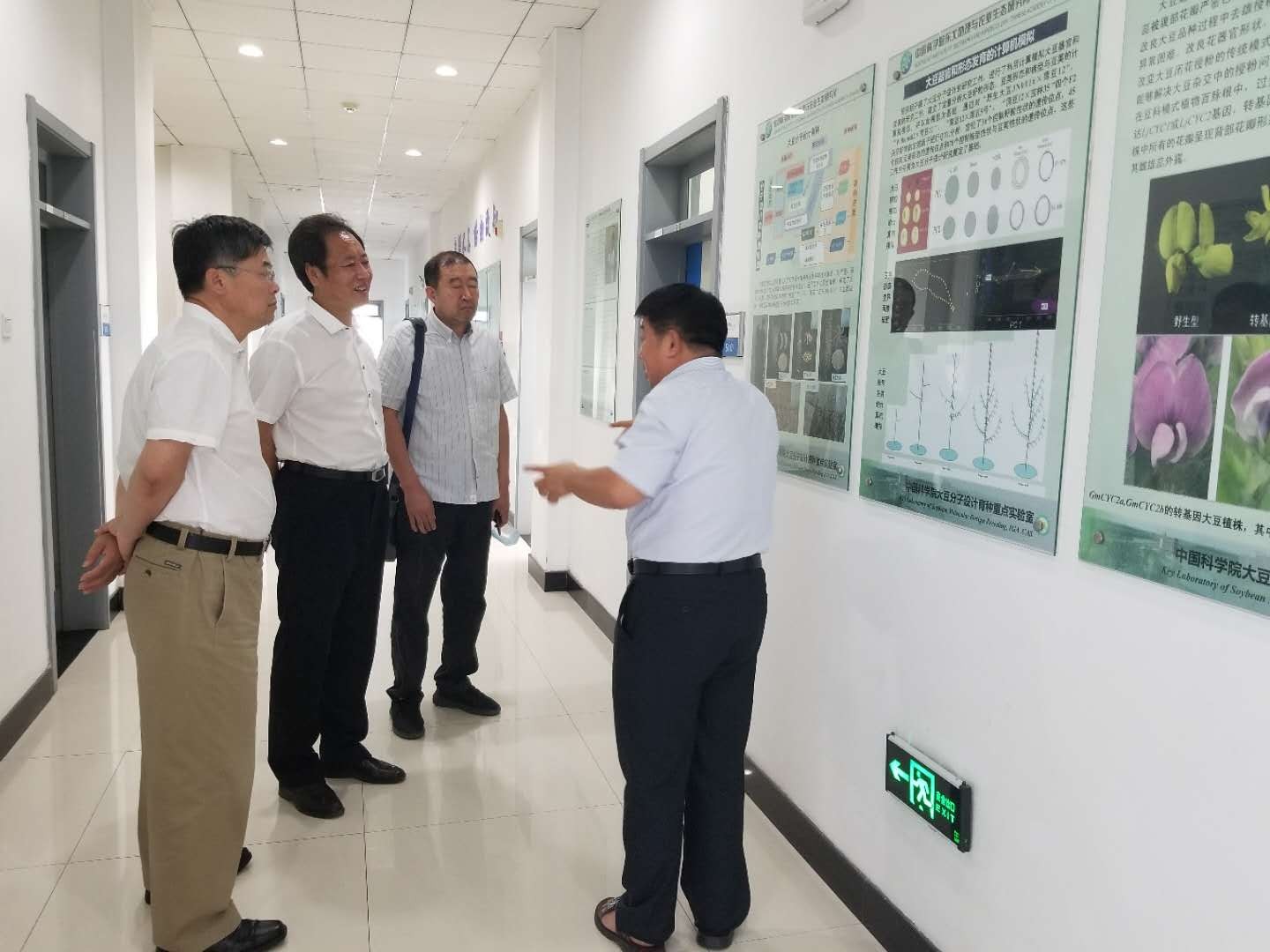隨后,崔軍先后到大豆分子育種學(xué)科組、鹽漬土生態(tài)與改良學(xué)科組進(jìn)行現(xiàn)場(chǎng)調(diào)研。馮獻(xiàn)忠研究員匯報(bào)了國(guó)家重點(diǎn)研發(fā)計(jì)劃“主要經(jīng)濟(jì)作物分子設(shè)計(jì)育種”項(xiàng)目情況。項(xiàng)目培育的大豆新品種使我國(guó)大豆育種進(jìn)入國(guó)際水平;東生和合農(nóng)系列大豆品種,連續(xù)四年累計(jì)在我國(guó)大豆主產(chǎn)區(qū)種植面積最大,成為我國(guó)大豆“振興計(jì)劃”的主栽品種,為解決大豆卡脖子問(wèn)題提供了優(yōu)良的品種。崔軍聽(tīng)后給予充分肯定同時(shí)指出,正在建設(shè)的“大豆人工智能育種平臺(tái)”應(yīng)加快進(jìn)度,為吉林農(nóng)業(yè)發(fā)展提供變革性技術(shù)。