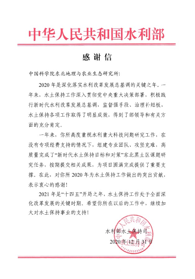 為了深入貫徹黨中央重大決策部署,積極踐行新時代水利改革發(fā)展總基調,監(jiān)督強手段、治理補短板,水利部于2019年啟動了“新時代水土保持目標和對策”水利重大科技研究項目,全國按八大片水土保持分區(qū)開展攻關。在沒有專項經費支持的情況下,東北地理所黑土退化與修復學科組會同黑龍江省水利科學研究院、吉林省水土保持科學研究院、吉林農業(yè)大學、松遼流域水土保持監(jiān)測中心站,承擔了“東北黑土區(qū)新時代水土保持目標與對策”專題研究,系統(tǒng)梳理了東北黑土區(qū)概況、水土流失現狀及其變化,在系統(tǒng)分析國家硬性規(guī)定退耕面積、需治理且能治理的水土流失面積、不能治理水土流失面積的基礎上,提出了到本世紀中葉東北黑土區(qū)允許水土流失率和水土保持率、新時代東北黑土區(qū)水土保持目標任務、防治對策、水土保持考評指標,按期提交了相關成果,近日通過水利部組織的驗收。為此,水利部水土保持司給東北地理所發(fā)來感謝信,肯定了研究所在2020年度為國家水土保持做出的突出貢獻,希望繼續(xù)加大對水土保持事業(yè)的支持。