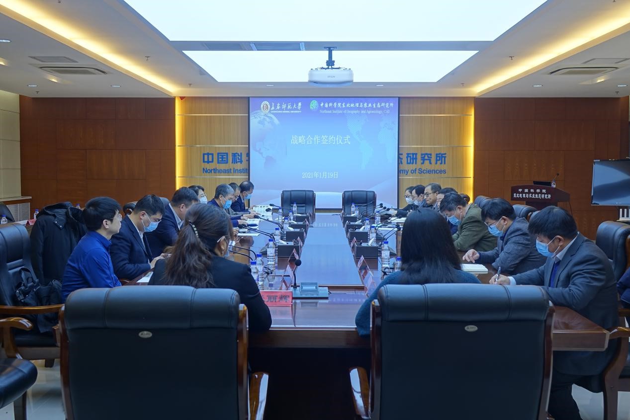 2021年1月19日,東北地理所與長春師范大學戰略合作協議簽字儀式在東北地理所舉行。吉林省教育廳科研產業處處長曾繁明出席了本次簽約儀式。長春師范大學校長劉春明、副校長張德利、研究生院院長許適琳、生命科學學院院長韓德復、地理科學學院院長費龍等一行十五人參加了簽字儀式。東北地理所所長姜明、黨委書記蘇陽、副所長王宗明、副所長武海濤、大豆重點實驗室主任馮獻忠、黑土重點實驗室主任田春杰、濕地重點實驗室副主任祝惠、海倫實驗站副站長李祿軍、人事教育處處長郭琳、科研計劃處副處長崔明星、研究生部主任王玉榮等參加了簽字儀式。簽字儀式由王宗明主持。