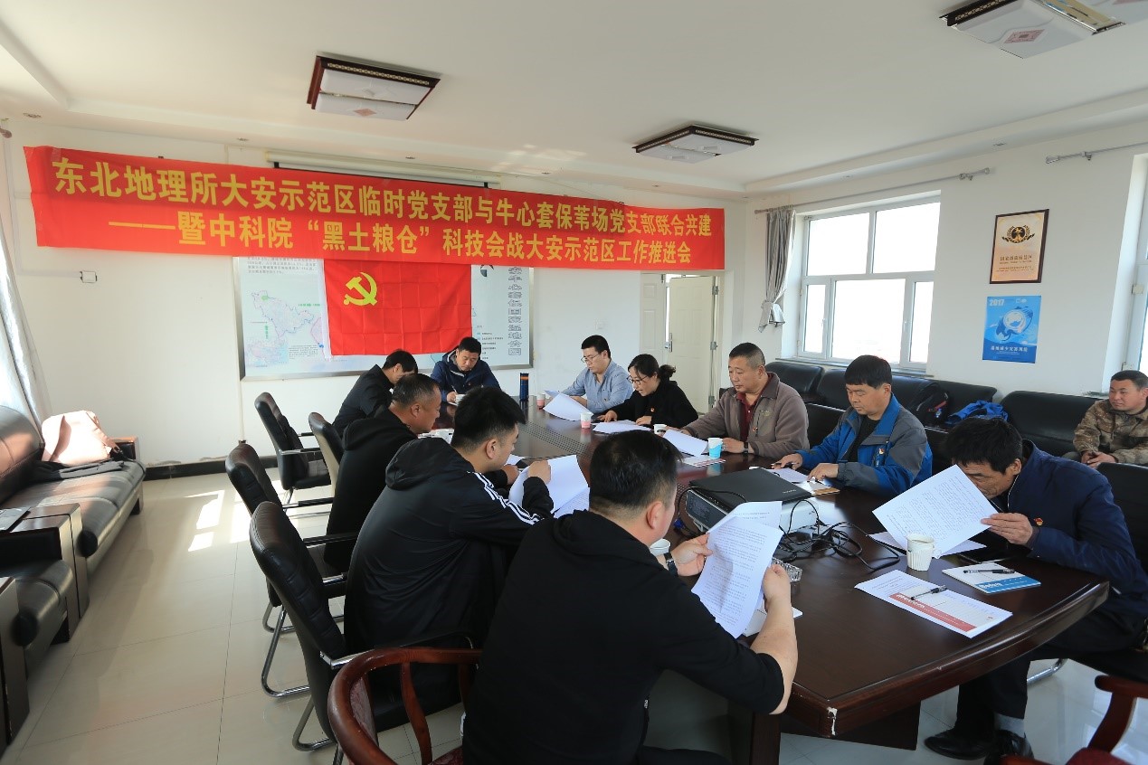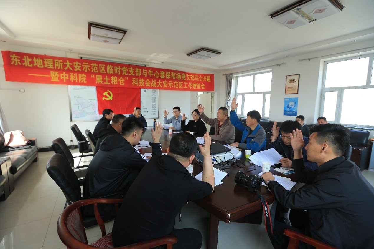 本次會議建立了東北地理所大安示范區(qū)臨時黨支部與牛心套保葦場黨支部聯合共建的新機制,樹起了會戰(zhàn)一線高高飄揚的第一面黨旗,強化了黨員在院地合作中的先鋒模范作用,彰顯了黨組織在“黑土糧倉”科技會戰(zhàn)中的戰(zhàn)斗堡壘作用,示范區(qū)臨時黨支部的建立必將為“黑土糧倉”科技會戰(zhàn)提供堅強的組織保障。