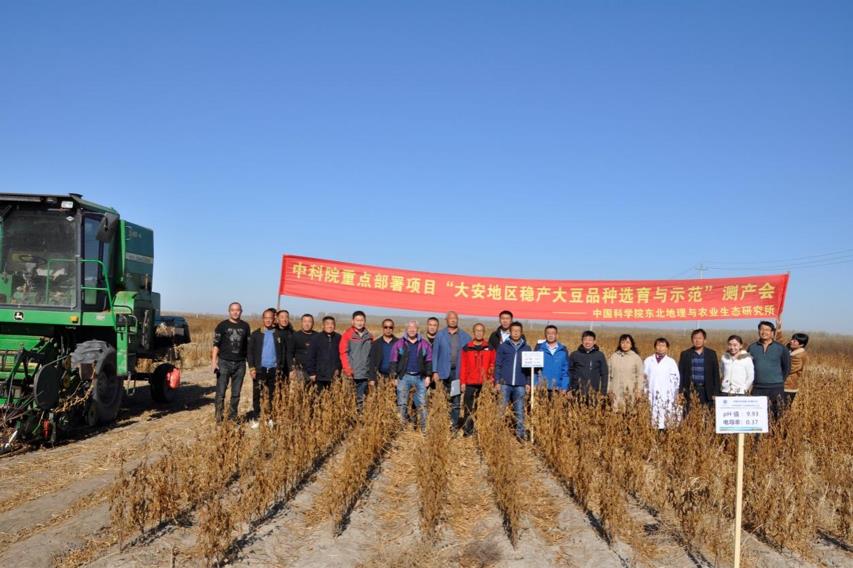 通過現場考察和測產,專家組一致認為測產田塊示范的大豆新品系具有較高的抗鹽堿性,配合品種專用的抗鹽堿栽培措施可以實現在大安地區蘇打鹽堿地種植,增產效果顯著;該項工作得到了中國科學院重點部署項目、中科院戰略性先導專項項目的資助。