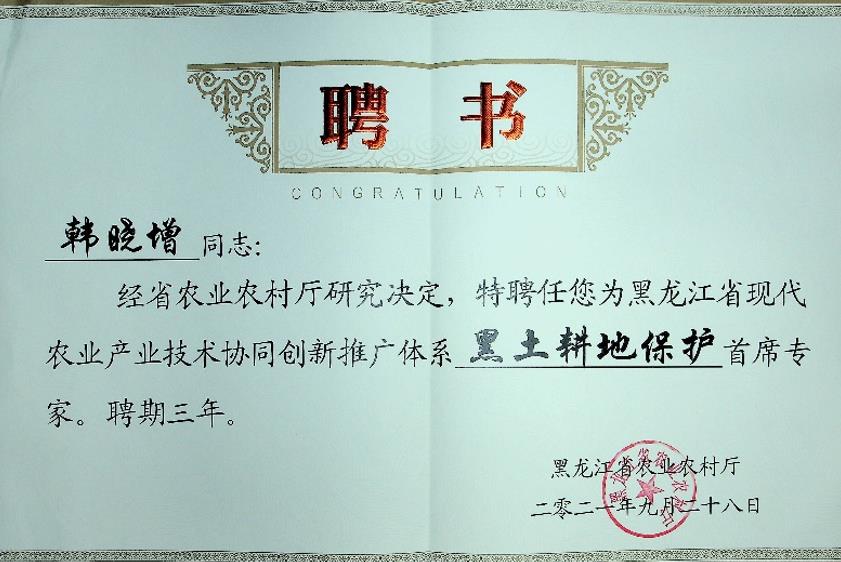 韓曉增受聘黑龍江省現代農業產業技術協同創新推廣體系黑土耕地保護首席專家