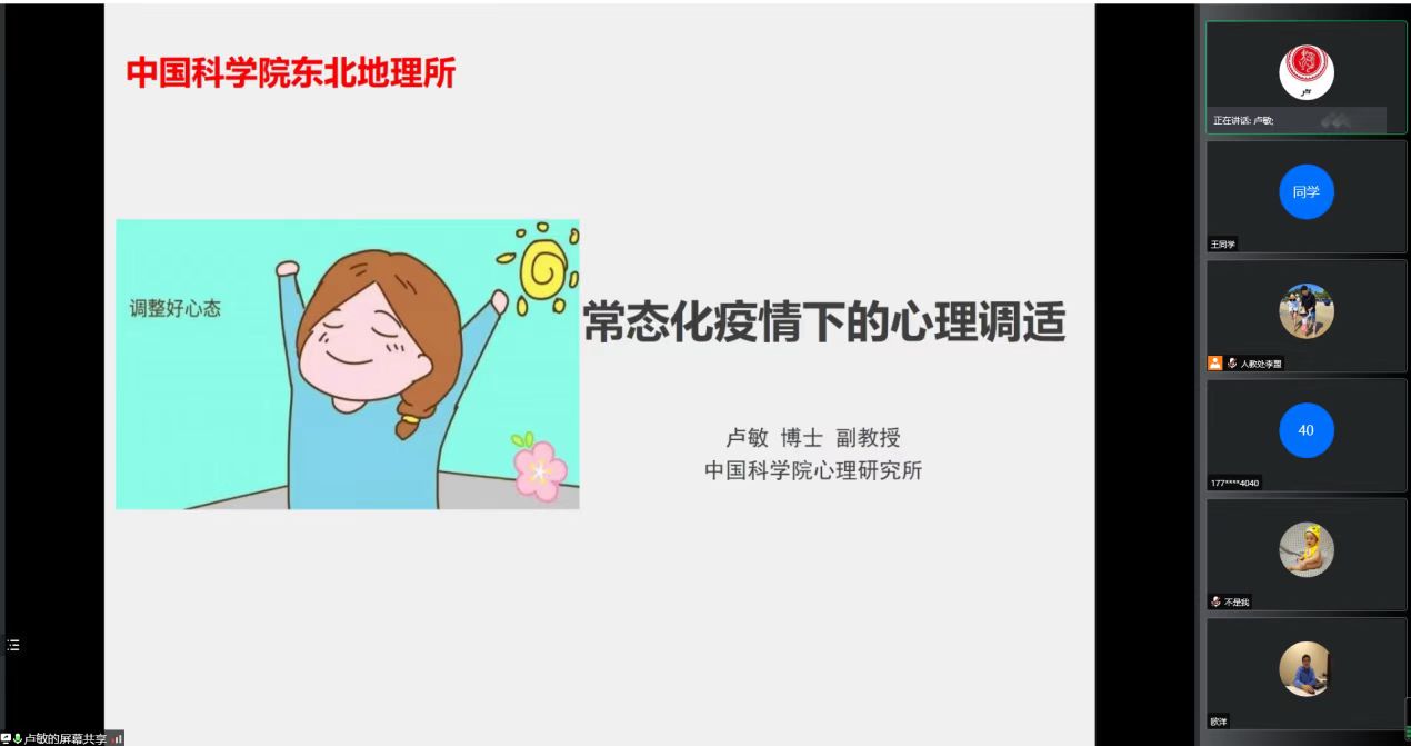 為更好地幫助東北地理所師生在疫情期間調適好心緒,為全面復工復產做好準備,4月15日,東北地理所邀請中科院心理研究所國家公務員心理健康應用研究中心副主任盧敏老師在線上進行了主題為“常態化疫情下的心理調適”的心理健康專題講座。本次講座由人事教育處處長郭琳主持,研究生、導師共計100余人參會。
