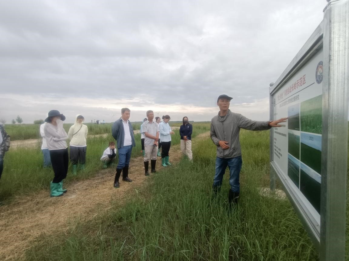 在大安牛心套保濕地示范基地,濕地模式負責(zé)人文波龍詳細介紹了濕地模式運行情況以及鹽堿稻田-濕地系統(tǒng)資源高效、生態(tài)健康一體化方案的整體思路及其當(dāng)前運行情況,現(xiàn)場講解了灌區(qū)退水工程濕地消納、鹽堿退化濕地恢復(fù)方面的示范工作進展;劉宏遠助理研究員詳細講解了蘇打鹽堿稻田以養(yǎng)促改、蟹種培育以及秋田放牧輔助秸稈還田等技術(shù)研發(fā)和示范工作,李曉宇副研究員介紹了沼澤濕地魚蟹生態(tài)放養(yǎng)、葦基食用菌栽培等濕地合理利用關(guān)鍵技術(shù)內(nèi)容。