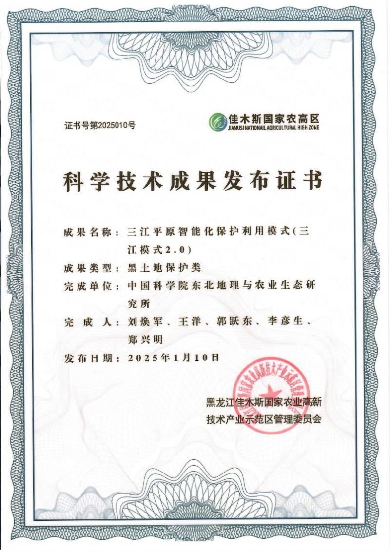 2025年1月10日,2025年佳木斯國家農高區新技術、新成果、新產品發布會在建三江米都大廈成功舉辦。發布會上,三江示范區發布三江平原智能化保護利用模式(三江模式2.0)、全場景智能施肥技術體系、“海綿農田”黑土地保護系統解決方案、北大荒“地塊畫像”數據集等6項技術。中國科學院東北地理與農業生態研究所重大項目辦公室李鶴副主任和三江示范區技術負責人王洋研究員參加了此次成果發布。