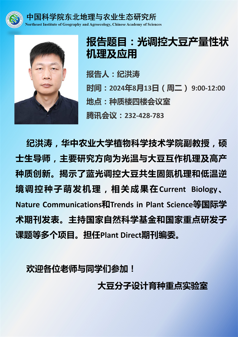光調(diào)控大豆產(chǎn)量性狀機理及應(yīng)用-紀(jì)洪濤 副教授